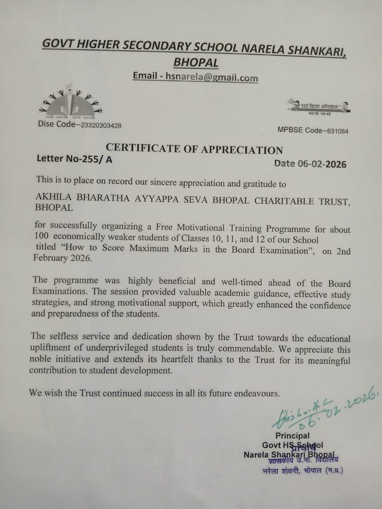 This Certificate of Appreciation has been awarded by the Government Higher Secondary School, Narela Shankari, Bhopal, to Akhila Bharatha Ayyappa Seva Bhopal Charitable Trust in recognition of organizing a Free Motivational Training Programme for approximately 100 economically weaker students of Classes 10, 11, and 12 of the school on the topic “How to Score Maximum Marks in the Board Examination” on 2nd February 2026.